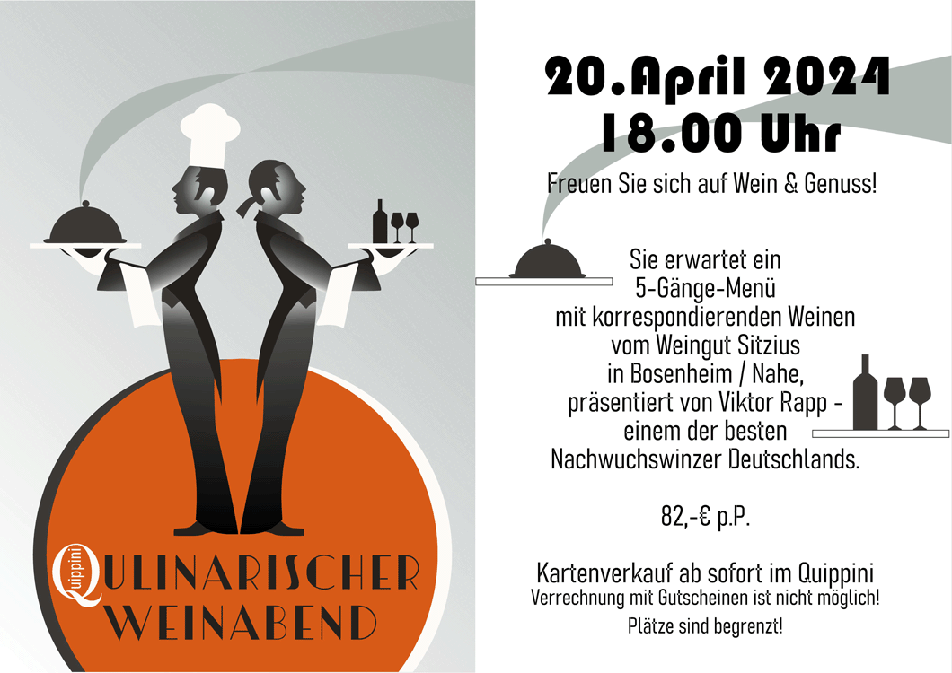 Freuen Sie sich auf den 3.Wein & Genuss Abend am Samstag, den 15.11.2025 , 18.00 Uhr ! Preis 99,-€ p.P. Sie erwartet ein 5-Gänge-Menue mit korrespondierenden Weinen. Durch den Abend führt Sie Viktor Rapp vom Weingut […]